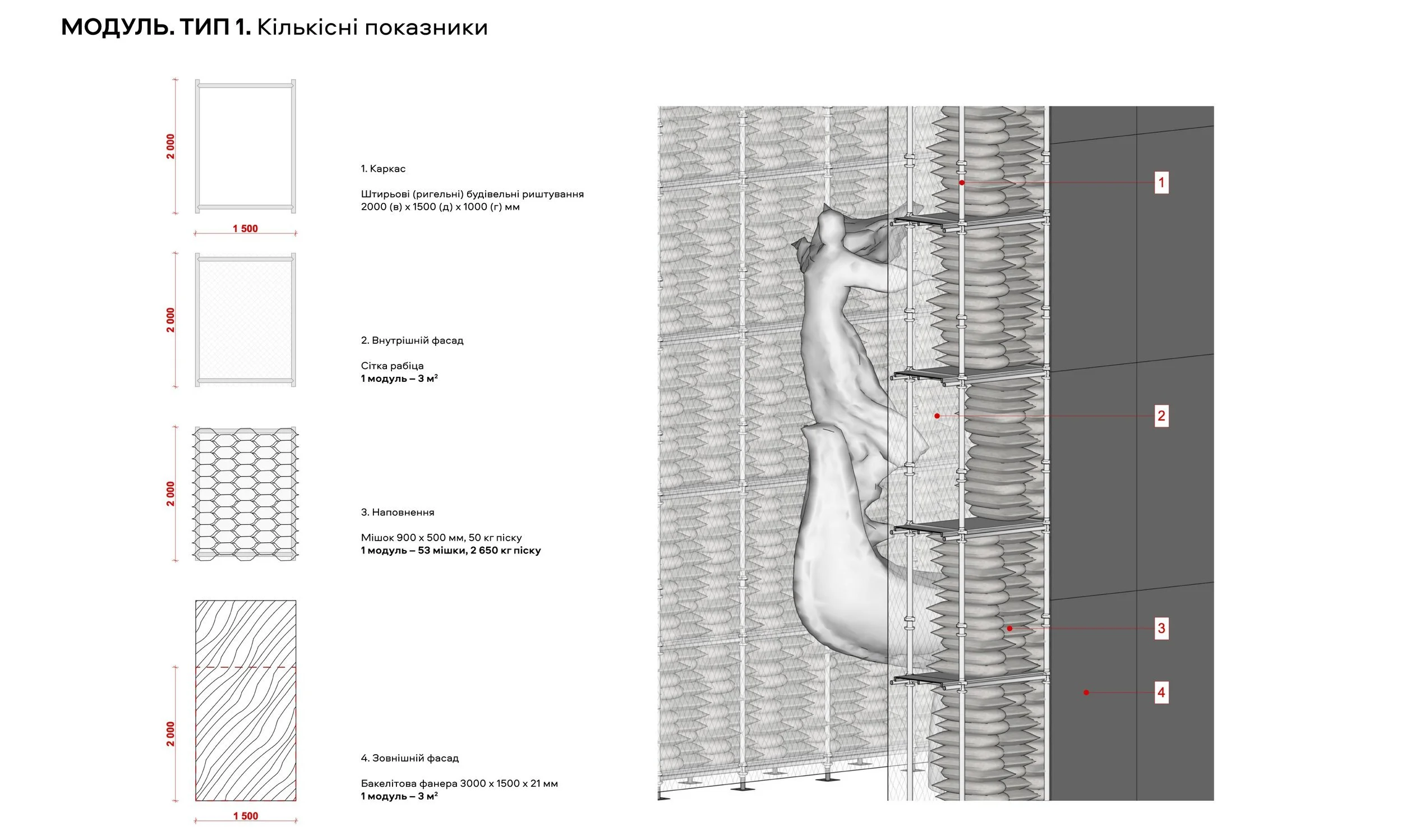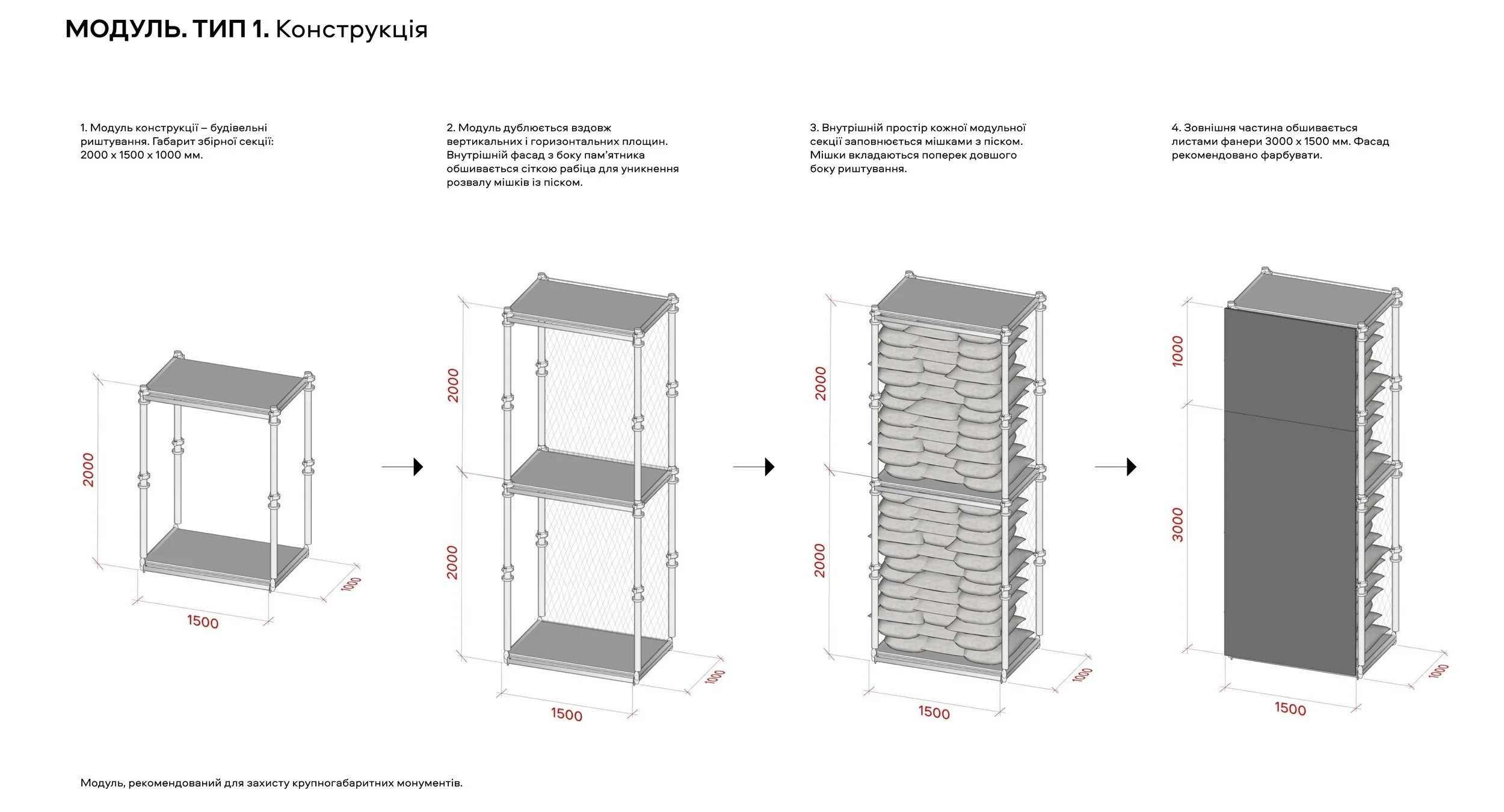 Каркас модуля ми пропонуємо складати з ригельного риштування. Ригелі та стійки, представлені в кількох фіксованих розмірах, легко знайти, доставити й зібрати на місці, як конструктор. Ригельний каркас встановлюють навколо пам’ятника, але не впритул до нього. Фасад конструкції зашивають вогнетривкою бакелітовою фанерою, стійкою до вологи та перепадів температур. Якщо пам’ятник великий, внутрішній фасад огороджують сіткою Рабіца, а простір між фанерою та сіткою заповнюють мішками з піском. Таким чином, навколо монумента з’являється захисна коробка, яка не контактує з пам’ятником і не обтяжує його. Згори конструкцію закривають профлистом.